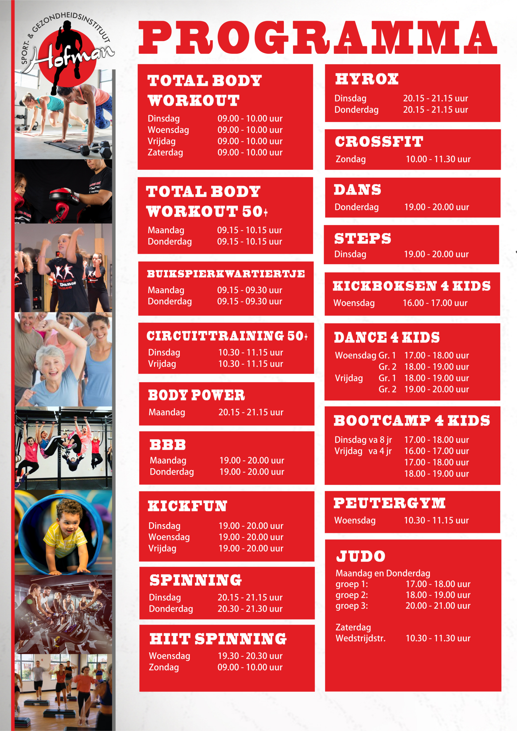 Total Body Workout voor alle leeftijden, Kickboksen, Spinnen, Jumplessen, BBB en nog veel meer. Liever individueel sporten? Ook dat kan in onze uitgebreide fitnessruimte. Wanneer ga jij starten? Ook voor de kids zijn er diverse groepslessen: Bootcamp, Peutergym, Dansen, Jumpen, Judo….